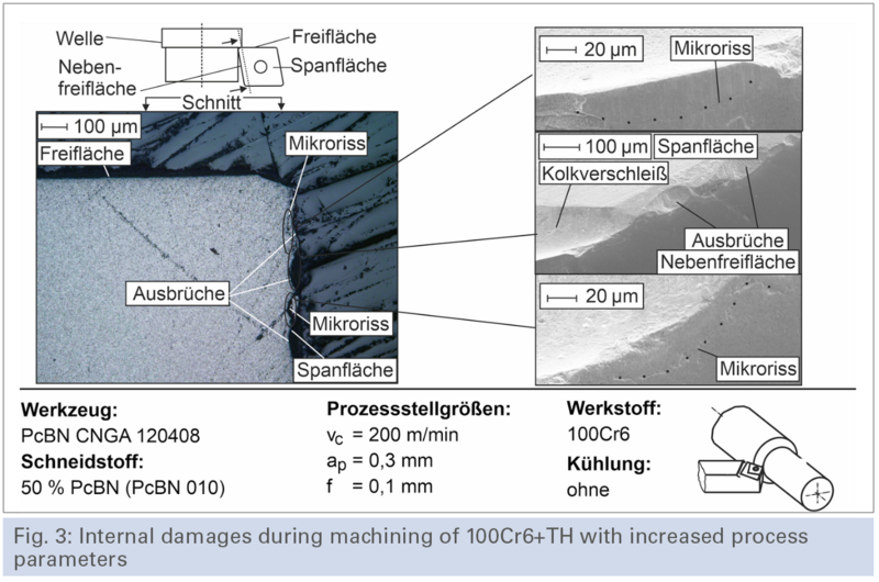 Subsequently, the tool with the most wear underwent an investigation of internal damages. For this purpose, micrographs and detailed images were taken using scanning electron microscopy (SEM) (see Fig. 3). Microcracks are visible in the micrographs of this tool. However, it is evident that these damages are localized and occur in the same areas as visible fractures. Additionally, SEM images show cracks on the flank face and further small fractures along the cutting edge.