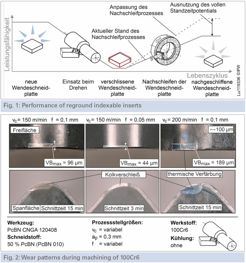 The Institute of Production Engineering and Machine Tools (IFW) at Leibniz University Hannover is working on a current research project to develop an optimized regrinding process for ultra-hard indexable inserts. The focus is not only on resource conservation but also on the economic efficiency and process reliability when using reground tools. This is achieved by considering not only the visible tool wear for determining regrinding parameters but also internal damage.