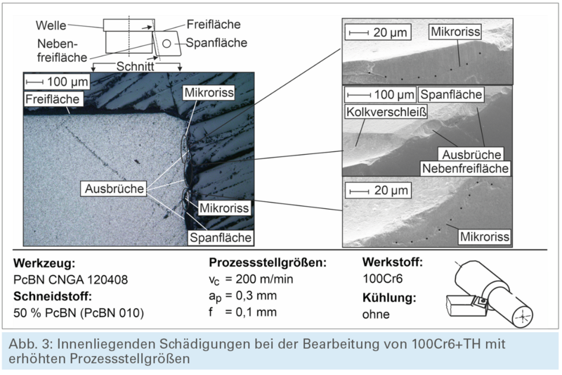 In ersten Versuchen wurden pCBN-Wendeschneidplatten mit einem CBN-Gehalt von 50% und einer keramischen TiC-Binderphase beim Außenlängsdrehen von gehärtetem 100Cr6 eingesetzt. Hierbei wurden die Schnittgeschwindigkeit vc und der Vorschub f variiert, um unterschiedlichen Verschleiß nach unterschiedlichen Schnittzeiten tc zu generieren. In Abbildung 2 sind drei verschiedene Verschleißzustände zu unterschiedlichen Schnittzeiten sowie unterschiedlichen Prozessstellgrößen dargestellt. Aufgrund der geringen Schnitttiefe im Prozess tritt der Verschleiß primär im Bereich des Eckenradius sowie der Nebenschneide auf.