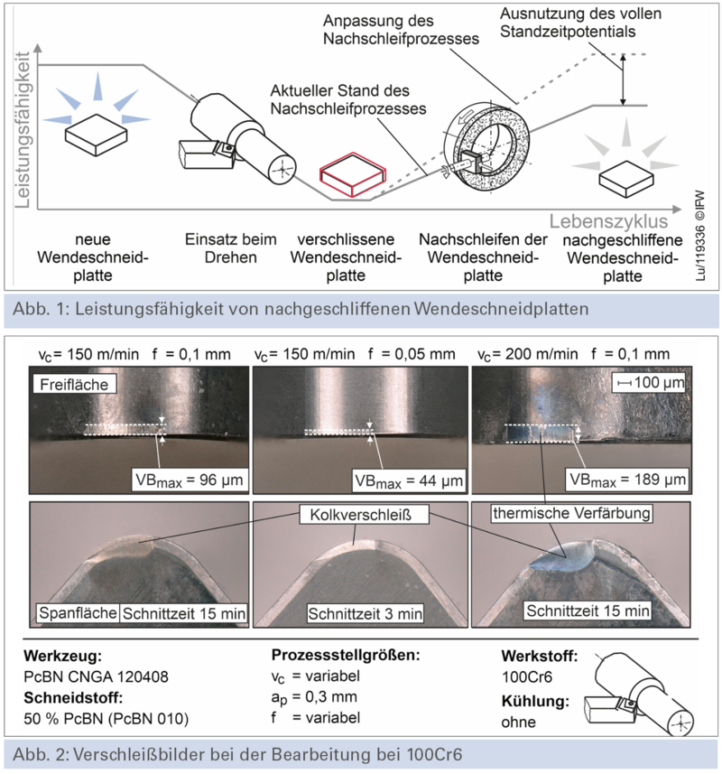 Das Institut für Fertigungstechnik und Werkzeugmaschinen (IFW) der Leibniz Universität Hannover arbeitet im Rahmen eines aktuellen Forschungsprojektes daran, einen angepassten Nachschleifprozess für hochharte Wendeschneidplatten zu entwickeln. Neben der Ressourcenschonung steht dabei auch die Wirtschaftlichkeit und die Prozesssicherheit beim Einsatz nachgeschliffener Werkzeuge im Fokus. Erreicht wird dies, in dem nicht nur der sichtbare Werkzeugverschleiß zur Festlegung der Nachschleifparameter herangezogen wird, sondern auch innenliegende Schädigungen berücksichtigt werden.