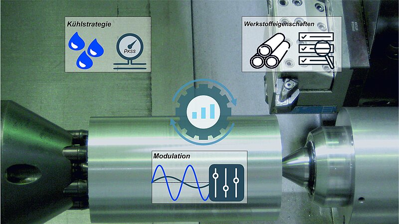 Um das Potenzial der Prozessstellgrößenmodulation aufzuzeigen, haben die Wissenschaftlerinnen und Wissenschaftler die grundlegenden Zusammenhänge zwischen der Auslegung der Modulation vor dem Hintergrund der werkstoffspezifischen Belastung untersucht. „Die Modulation kann grundsätzlich in die Strategien in Schnittgeschwindigkeitsmodulationen‘ sowie ‚kombinierte Schnittgeschwindigkeits- und Vorschubmodulationen‘ eingeteilt werden“, erläutert Heckemeyer.