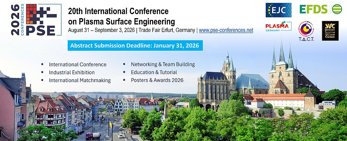 Die 20. International Conference on Plasma Surface Engineering (PSE 2026) zählt zu den weltweit etablierten Leitveranstaltungen im Bereich der plasma- und ionenbasierten Oberflächentechnologien. Vom 31. August bis 3. September 2026 trifft sich die internationale Fachcommunity auf dem Messegelände Erfurt, um aktuelle Entwicklungen aus Forschung, Entwicklung und industrieller Anwendung zu diskutieren.