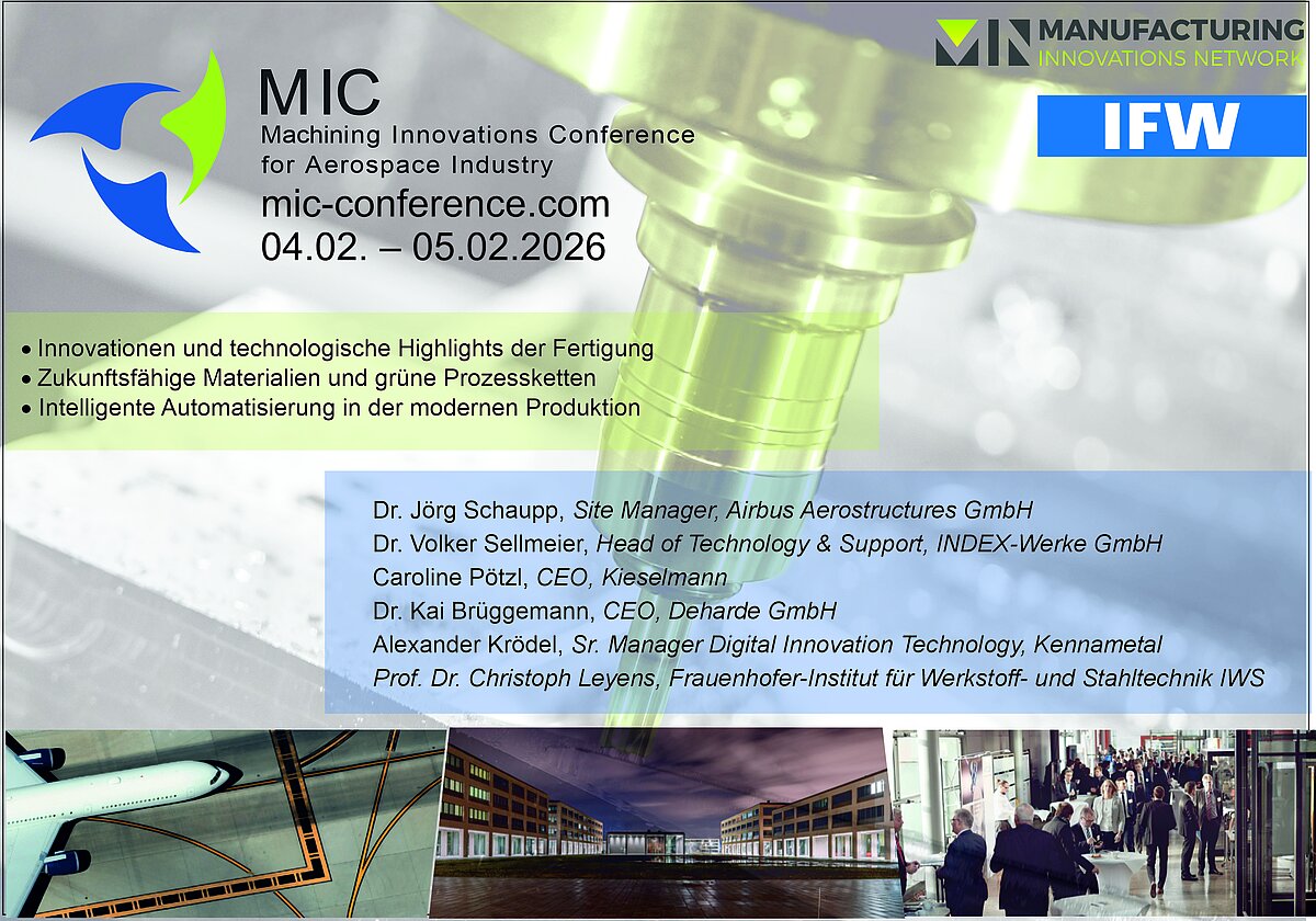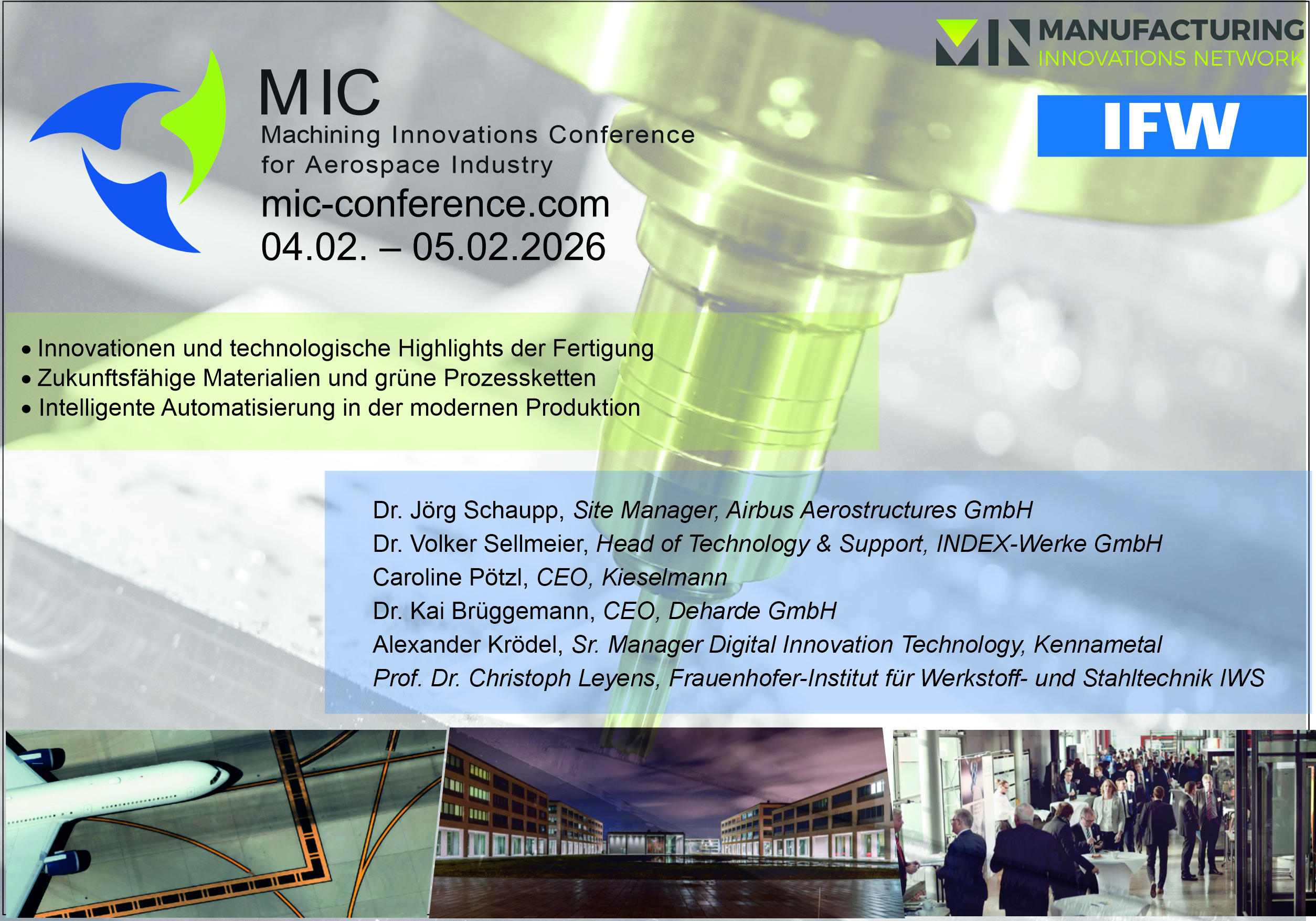 Als Reaktion auf diesen Wandel treibt die Luft- und Raumfahrtindustrie die Entwicklung von Spitzentechnologien voran, um die Luftfahrt von morgen zu gestalten. Innovationen dieser Art entstehen erst durch intensiven Austausch. De ideale Plattform für diesen Dialog wird durch das Manufacturing Innovations Network e.V. (MIN) und das Institut für Fertigungstechnik und Werkzeugmaschinen (IFW) der Leibniz Universität Hannover mit der "Machining Innovations Conference for Aerospace Industry" (MIC-Konferenz) geschaffen.