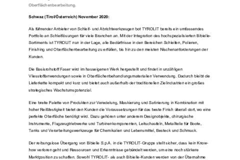 November 2020 1 PRESSE INFORMATION TYROLIT ÜBERNIMMT BIBIELLE S.P.A. Ende Juli 2020 akquirierte die TYROLIT Gruppe die Bibielle S.p.A. - ein führender Hersteller von hochwertigem dreidimensionalen Schleifmaterial -…