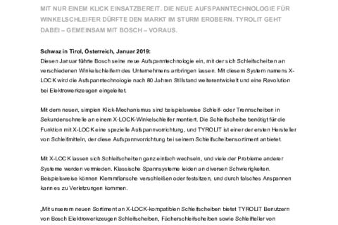 15.03.2021 Seite 1 PRESSEMITTEILUNG TYROLIT PRÄSENTIERT X-LOCK-KOMPATIBILITÄT: EINE REVOLUTION IN DER AUFSPANNTECHNOLOGIE MIT NUR EINEM KLICK EINSATZBEREIT. DIE NEUE AUFSPANNTECHNOLOGIE FÜR WINKELSCHLEIFER DÜRFTE DEN…